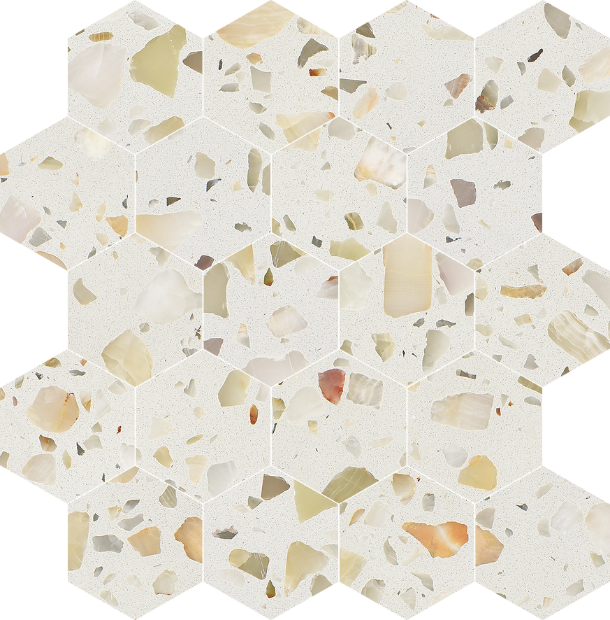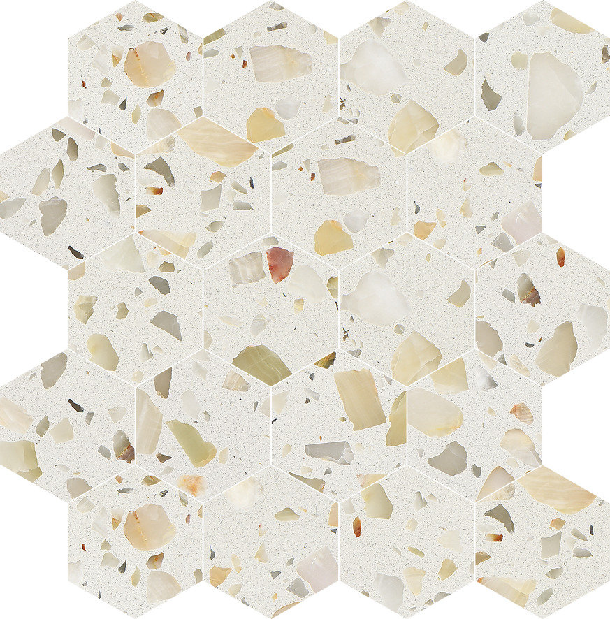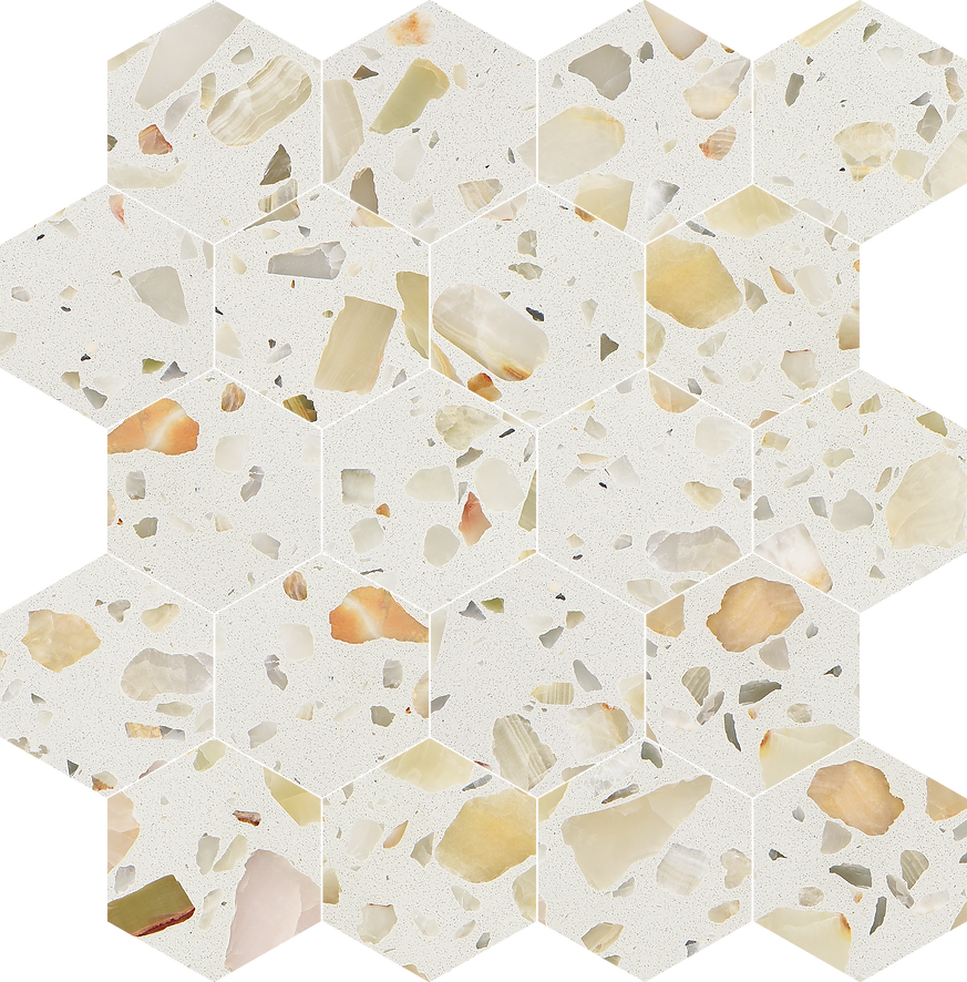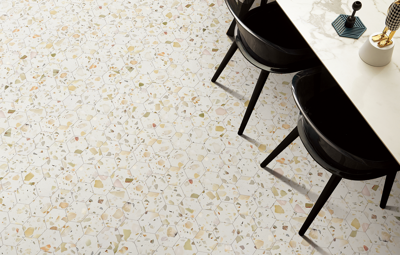The Allegro Collections features an engineered stone, also known as Terrazzo, is a composite material made of natural stone bound together by an adhesive. Terrazzo started in Venice, translating to terrace in Italian. It is made from concrete or cement base, a mix of natural stone chips, granite, glass, and more. The whole thing is sealed with a weighted roller and gets a nice polish. The result is an ever-unique, composite-looking décor option.