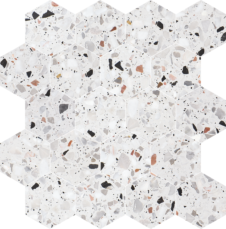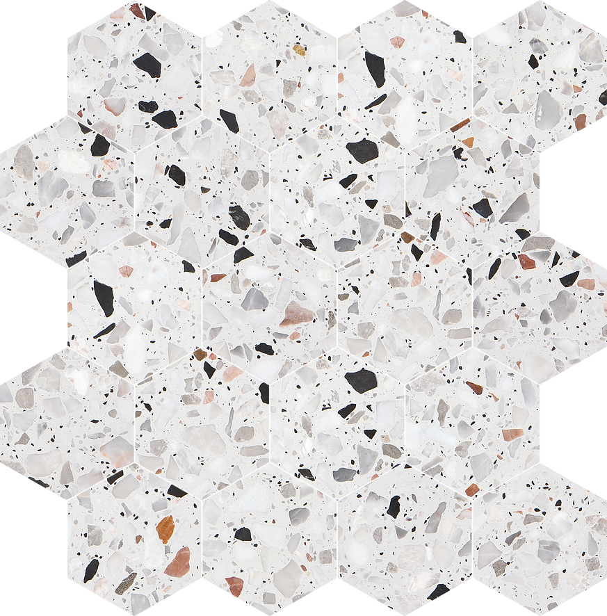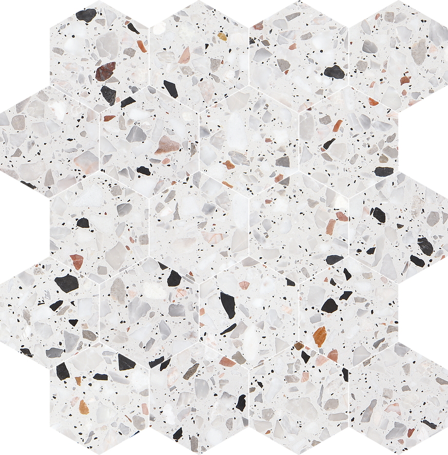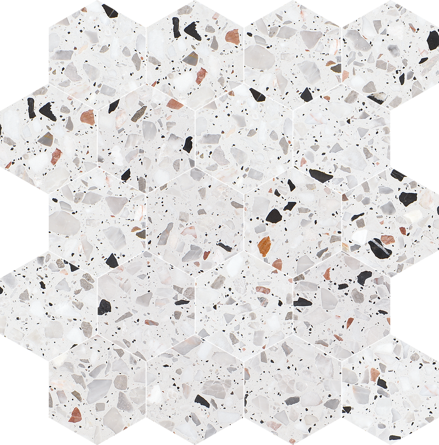 The Allegro Collections features an engineered stone, also known as Terrazzo, is a composite material made of natural stone bound together by an adhesive. Terrazzo started in Venice, translating to terrace in Italian. It is made from concrete or cement base, a mix of natural stone chips, granite, glass, and more. The whole thing is sealed with a weighted roller and gets a nice polish. The result is an ever-unique, composite-looking décor option.