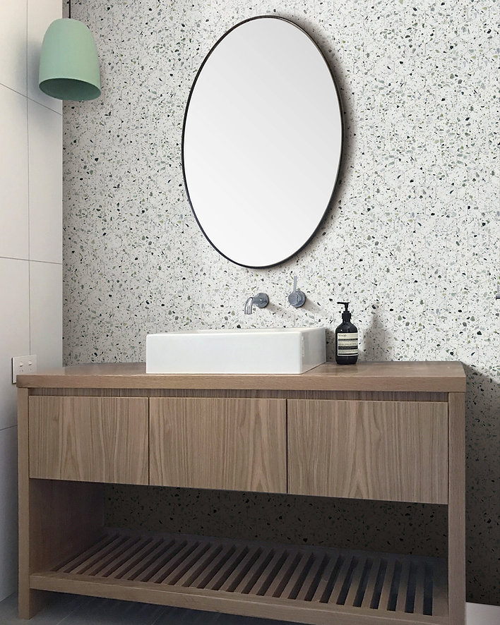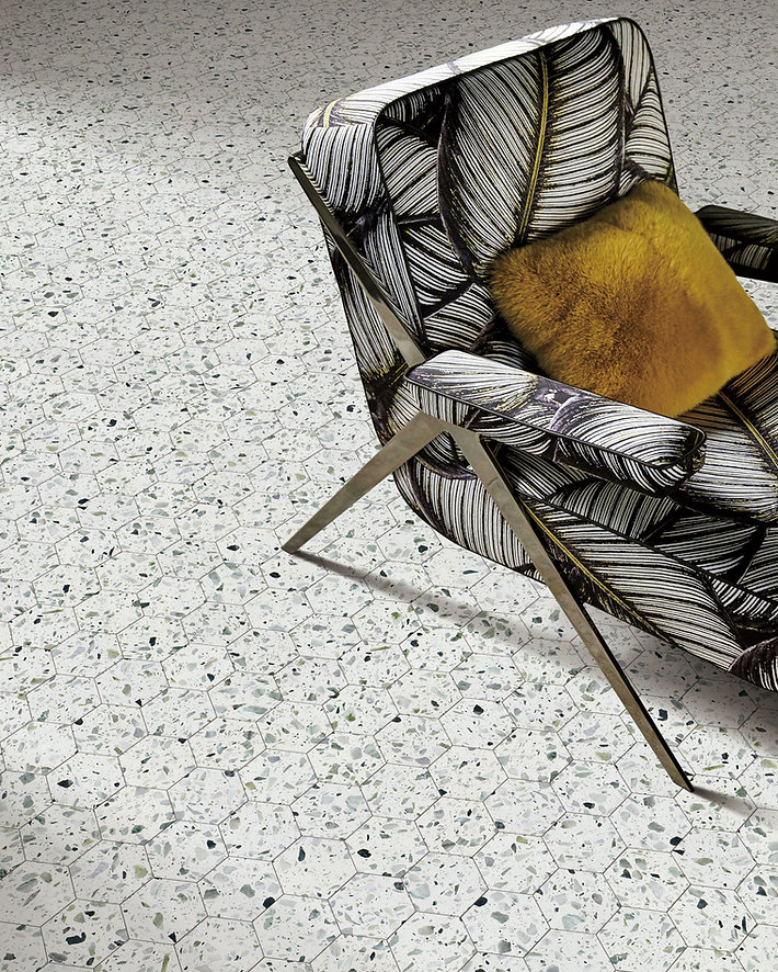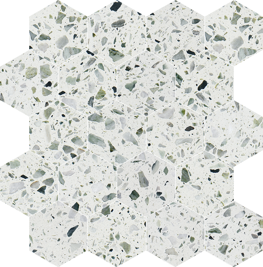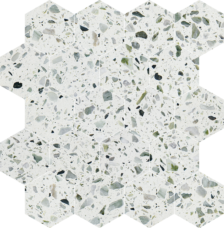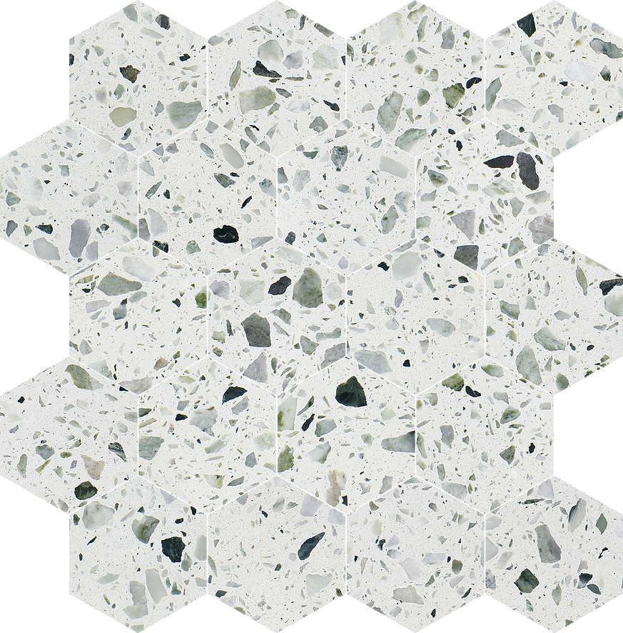 The Allegro Collections features an engineered stone, also known as Terrazzo, is a composite material made of natural stone bound together by an adhesive. Terrazzo started in Venice, translating to terrace in Italian. It is made from concrete or cement base, a mix of natural stone chips, granite, glass, and more. The whole thing is sealed with a weighted roller and gets a nice polish. The result is an ever-unique, composite-looking décor option.